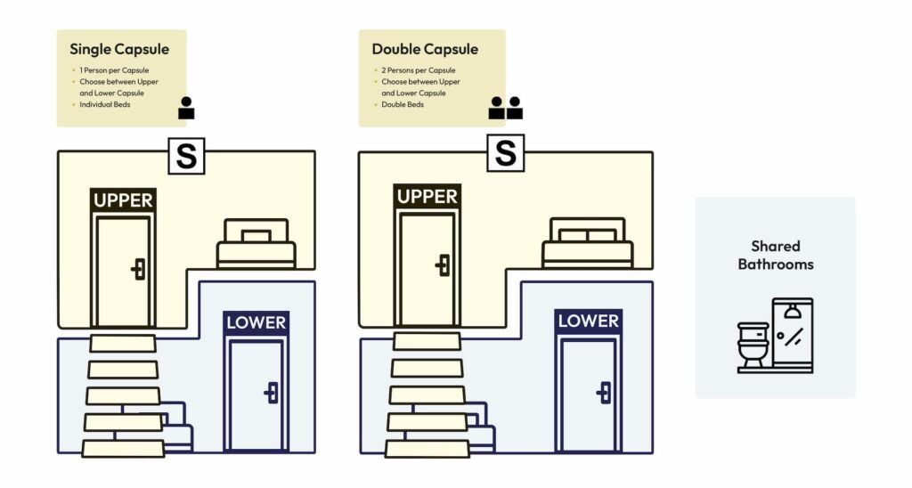 Al reservar, puedes elegir entre cápsulas superiores, con acceso mediante una pequeña escalera y una sensación más elevada y acogedora, o cápsulas inferiores, con acceso directo para una estancia fácil y sin complicaciones.